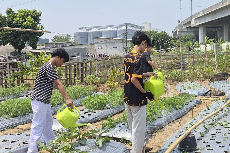 Dengan celana putih sekolah yang masih menempel, tiga orang Gen Z terlihat masuk ke lahan urban farming seluas 1,5 hektare bernama Bangun Karya Mandiri.